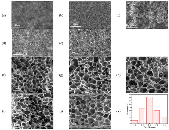 (a–e) SEM surface images from GPE-0 to GPE-20; (f–j) the SEM cross-section from GPE-0 to GPE-20; (k) the aperture distribution diagram of GPE-10.