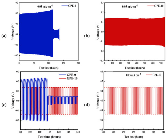 Electrochemical performance: (a) 0.05 mA cm−2 Li|GPE-0|Li symmetric cells; (b) 0.05 mA cm−2 Li|GPE-10|Li symmetric cells; (c) voltage-time plots of symmetric cells at 100–130 h; (d) voltage-time plots of symmetric cells at 680–710 h.