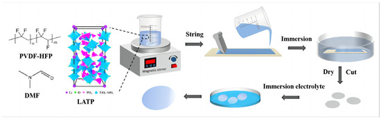 The raw materials include polyvinylidene fluoride-hexafluoropropylene (PVDF-HFP, Arkema, Colombes, France), Li1.3Al0.3Ti1.7(PO4)3 (LATP, Macklin, Shanghai, China), N, N-dimethylformamide (DMF, Macklin, Shanghai, China), LiFePO4 (LFP, Macklin, Shanghai, China), conductive carbon black (SUPER P, Macklin, Shanghai, China), and polyvinylidene fluoride (PVDF, Macklin, Shanghai, China).