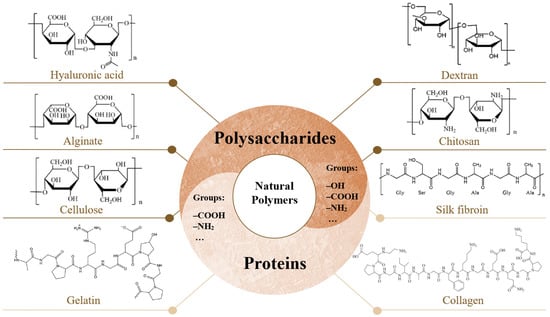 Representation of the chemical structures of some natural polymers classified into proteins (collagen, gelatin, and silk fibroin) and polysaccharides (alginate, hyaluronic acid, cellulose, dextran, and chitosan).