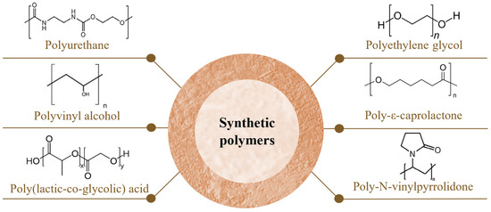 Synthetic polymers (Figure 2) are chemically synthesized and exhibit controllable and predictable properties. They maintain constant and homogeneous physicochemical properties, often displaying excellent mechanical properties and controlled degradation [5,11,17,39,40]. Some synthetic polymers, such as polyesters, are biodegradable and generally more cost-effective compared to natural polymers [40] and have more abundant sources of raw materials [5]. However, unlike natural polymers, which are biologically inert, synthetic polymers carry the associated toxicity risk and may present biocompatibility issues [17,39,40].