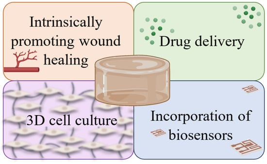Due to their intrinsic properties, hydrogels fulfill various requirements for an ideal wound dressing [10]. They offer protection against microorganisms and new lesions [3]. Additionally, they can absorb large amounts of water, up to thousands of times their dry weight [5,11]. Therefore, the highly hydrated three-dimensional (3D) polymeric network allows for the maintenance of a high level of moisture in the wound bed [11]. Moreover, they adhere to the wound but are also easily removable. Their transparency facilitates visual inspection of the wound, and they are customizable and easily adapt to the contours of the wound, promoting autolytic debridement (removal of debris and necrotic tissues), and intrinsically stimulating healing through various mechanisms [5]. These mechanisms include promoting angiogenesis (formation and growth of blood vessels) in wounds with poor perfusion, modulating the immune cells within the wound, or enhancing the migration of keratinocytes and fibroblasts in wound healing [12,13,14,15]. Hydrogels overcome some limitations of traditional treatments, such as prolonged healing, limited body movement, traumatic removal, and poor regeneration of skin attachments [6].