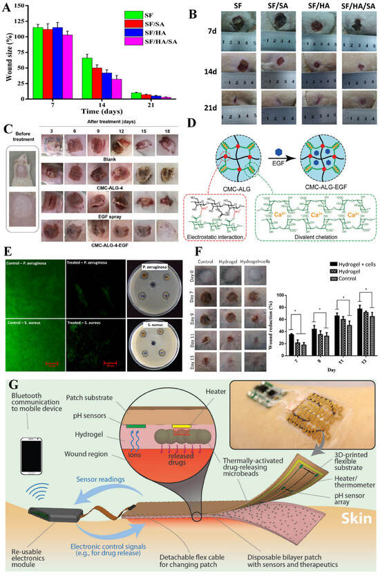 - Dong, M.; Mao, Y.; Zhao, Z.; Zhang, J.; Zhu, L.; Chen, L.; Cao, L. Novel fabrication of antibiotic containing multifunctional silk fibroin injectable hydrogel dressing to enhance bactericidal action and wound healing efficiency on burn wound: In vitro and in vivo evaluations. Int. Wound J. 2022, 19, 679–691. [Google Scholar] [CrossRef]