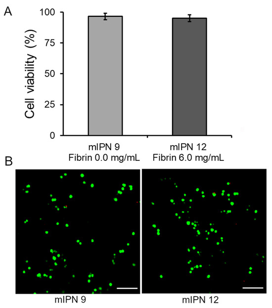 Our final goal was to assess that our fabrication procedure yielded cytocompatible scaffolds capable of supporting the 3D in vitro culture of human astrocyte cells, enabling future studies on cellular responses. Toward this end, the live/dead viability assay was performed 24 h post-cell encapsulation in the mIPN 9 and mIPN 12. The assay determined the ratio of live cells stained with green fluorescence to the total number of cells. The results indicated that the cell viability was 96.5 ± 2.6% for mIPN 9 and 95.2 ± 2.8% for mIPN 12 (Figure 5A), with no statistically significant difference in mean values. The viability of astrocytes was observed to be consistent even after 24 h of fabrication, regardless of the fibrin content in the hydrogels. These findings suggest that mIPNs and the fabrication method do not impair cell viability and offer support for this type of CNS cells. Notably, these results agree with previous studies of encapsulated CNS cells in hydrogels comprising similar components, which also reported conserved cell viability [46]. These results also agree with previously reported results from our laboratory [22].