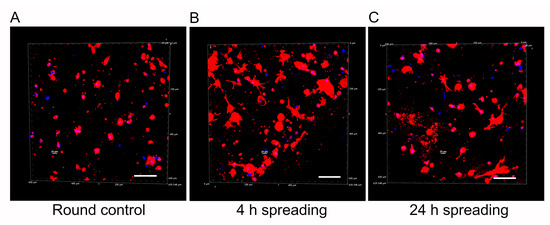 Representative 3D reconstructions of DAPI/phalloidin-stained human cortex astrocytes in mIPN 12 as a function of the spreading time before PEGDA infiltration. (A) Round control. (B) 4 h spreading time. (C) 24 h spreading time. The cell cytoskeleton is stained in red with rhodamine-phalloidin, and the cell nuclei are stained in blue with DAPI; scale bar = 100 µm.