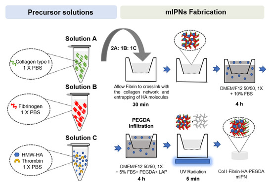 Once all precursor solutions were prepared, solutions A, B, and C were carefully mixed on ice at a 2:1:1 ratio, respectively. Once all components were well mixed, 75 µL of mIPN precursor solution was pipetted into 24-well culture inserts (8 μm pore size, Greiner Bio-One, Monroe, NC, USA) and allowed to physically crosslink at 37 ℃ and 5% CO2 in the cell culture incubator for 30 min. Following the crosslinking of the Col I and fibrin and the entrapping of HA molecules, Dulbecco’s Modified of Eagle’s Medium/ F-12 without phenol red (DMEM/F12 50/50, 1×, Corning, Manassas, VA, USA) supplemented with 10% fetal bovine serum (FBS, Atlas Biological, Fort Collins, CO, USA), and 1% penicillin-streptomycin (PS, Gibco, Grand Island, NY, USA) was added above and below the inserts. To ensure that the physically intertwined HMW-HA molecules remained contained in the scaffolds, the cell culture media was supplemented with HMW-HA, matching the levels of HA in the target mIPN. The constructs were then placed in the cell culture incubator for 4 h. Following the incubation period, the culture media was replaced with an infiltration solution composed of DMEM/F12 50:50, 1X without phenol red, supplemented with 5% FBS and 1% PS, PEGDA of varying molecular weight and concentration, and 1 mM of lithium phenyl-2,4,6-trimethylbenzoylphosphinate (LAP) as photoinitiator and HMW-HA when appropriate. After a 4 h incubation period, the PEGDA infiltrating solution was carefully removed, and the constructs were exposed to 365 nm UV radiation for 5 min using a TL-365R Spectroline UV transilluminator (Spectronics Corporation, Westbury, NY, USA). PEGDA and LAP were synthesized as we have described in previous works [48,49]. A schematic representation of the mIPN fabrication process is shown in Figure 7.