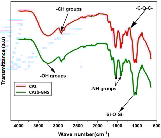 A broad band between 3000 and 3500 cm−1 shows -OH stretching of intermolecular and intramolecular hydrogen bonding (Figure 1). The characteristics peaks at 2920 and 1246 cm−1 show -CH and -C-O-C- stretching, respectively [27]. The peaks at 1400 and 1500 cm−1 are attributed to -NH stretching. A characteristic peak of siloxane (-Si-O-Si-) can also be seen at 1065 cm−1. The presence of siloxane linkage among chitosan, PVA and GNS in CP2b-GNS is evident from the FTIR investigation [28].