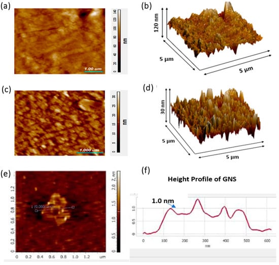 AFM was used to study the surface roughness of the prepared hydrogels CP2b and CP2b-GNS. Figure 2 shows the AFM images for both the hydrogel samples and GNS. The measured surface roughness is illustrated in Table 1. It can be seen that CP2b has higher surface roughness than CP2b-GNS. Although CP2b contains the optimized concentration of TEOS cross-linker, it is still left with some porous structure. When GNS is added in cross-linked CP2b, an increased area of GNS shelters those pores [29]. The increased surface area coverage of GNS to the hydrogel with TEOS results in the smooth surface morphology and hence the decreased roughness as compared to CP2b. GNS sheets inherent smoothness also contributed to smoother surface of the hydrogels as can be seen in Figure 2e,f.