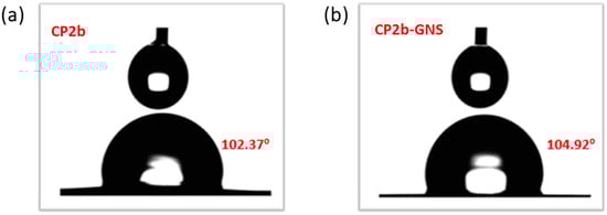 For hydrogel samples, wetting analysis plays an important role in determining whether the hydrogel is hydrophobic or hydrophilic. In this regard, the optimized cross-linking of TEOS is very important as it can shift the behaviour from hydrophilic to hydrophobic [30]. The contact angle of the CP2b is 102.37° which is slightly less than the contact angle of CP2b-GNS (Figure 3). The hydrophilic nature of GO is due to the functional groups available on its surface and edges [28]. In the present work, GNS were synthesized by CVD and have no or very few functional groups available for hydrogen bonding, thus these have hydrophobic nature. Due to their hydrophobic nature, increase in the contact angle of CP2b-GNS is obvious [31]. It can be concluded that CP2b-GNS gel is more hydrophobic than pristine gel.