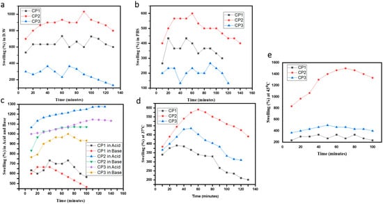 Time vs. Swelling % of CP1, CP2 and CP3 in (a) distilled water (b) PBS (c) acidic (HCl at pH 4) and basic (NaOH at pH 10) solutions (d,e) effect of temperature of the medium.