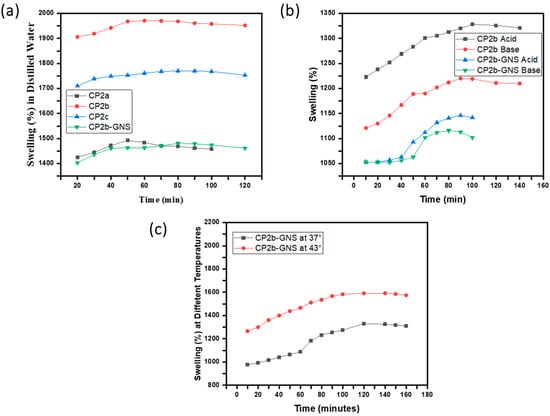 Time vs. Swelling % of CP2a, CP2b, CP3c, and CP2b-GNS in (a) distilled water, (b) acid-base (HCl at pH 4 and NaOH at pH 10), and (c) at different temperatures.