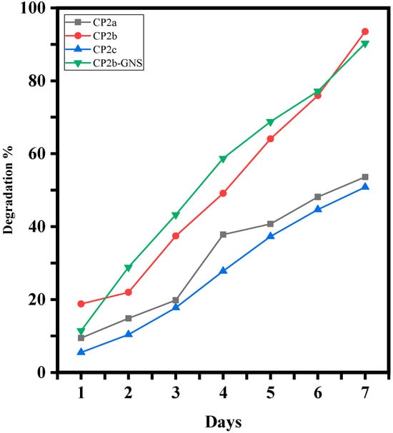 To determine how well-dried hydrogel films degrade, the degradation of hydrogel films in PBS medium was investigated (Figure 6). The hydrogel sample CP2b was found to disintegrate more quickly than the hydrogel samples CP2a and CP2c. In comparison to CP2a, CP2b, and CP2c, the hydrogel sample CP2b-GNS containing 0.5% of GNS showed much faster degradation. This typical behaviour of hydrogel shows that GNS has not developed bonding with the hydrogel matrix. Previously, our co-authors reported [23] that similar GO-based hydrogel disintegrates slowly in PBS solution which was mainly due to GO ability to form crosslinks with the polymeric matrix of the hydrogel through its functional groups. The comparison confirms that graphene-based hydrogels would have faster degradation.