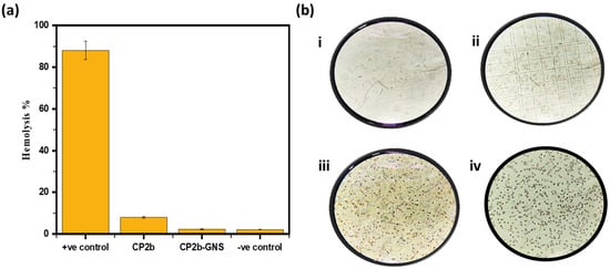 To determine if hydrogel was compatible with mammalian cells, hemolytic analysis was carried out. After hydrogel was exposed to erythrocytes from humans for hemocompatibility investigation, the hemolysis percentage to the very toxic surfactant triton-X was determined [32]. In contrast to CP2b, hydrogel CP2b-GNS remarkably showed very little hemolysis (Figure 7a). This demonstrated the hemocompatibility of hydrogel towards human red blood cells. In order to enhance understanding, treated erythrocytes were examined under a microscope. The treated cells had the normal round shape of healthy blood cells, but no cells were seen under a microscope and no survival was shown in the positive control (TX-100) as can be seen in Figure 7b.