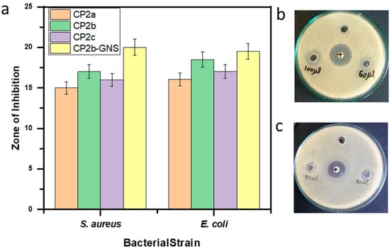 (a) Antibacterial activity of CP2a, CP2b, CP2c and CP2GNS against Gram +ve Staphylococcus aureus (S. aureus) and Gram −ve Escherichia coli (E. coli), (b) Zone of inhibition of CP2b-GNS against Gram +ve Staphylococcus aureus (S. aureus), (c) Zone of inhibition of CP2b-GNS against Gram −ve Escherichia coli (E. coli).