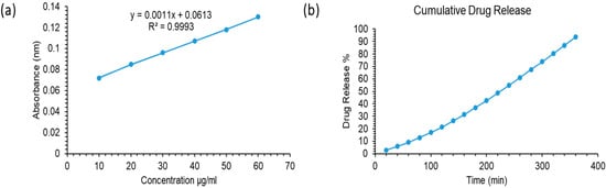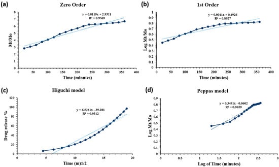 In PBS medium (pH 7.4 at 37 °C), the drug release was assessed. The drug release kinetics were assessed using the mathematical models (Equations (1)–(4)).