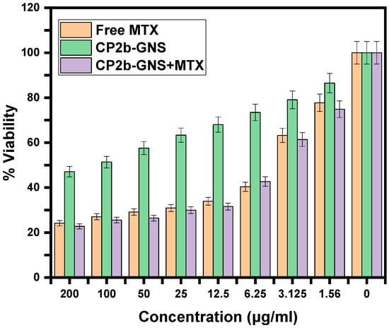 HepG2 cells were cultured in a medium that contains different concentrations of free MTX, CP2b-GNS and CP2b-GNS+MTX to evaluate therapeutic effectiveness of the hydrogel. The methyl thiazole tetrazolium test was then used to determine the relative cell viability [39]. There is no noticeable toxicity (>80% cell viability) assessed for pure CP2b-GNS at a high concentration of 100 mg/mL for HepG2, showing that the carrier alone is not cytotoxic and the higher efficacy should be expected by the contribution of the drug bound to CP2b-GNS (Figure 11). The water-soluble CP2b-GNS+MTX complexes exerted a greater substantial cytotoxic impact on tumor cells. The 50 percent inhibition of growth was shown by CP2b-GNS+MTX at a concentration (IC50) of ≈5.87 μg/200 mL, whereas free MTX showed 50 percent growth inhibition at a concentration (IC50) of ≈5.03 μg/200 mL. In other words, CP2b-GNS hydrogel can enhance drug effectiveness without increasing the amount of the drug. Because MTX molecules passively diffuse through the plasma membrane, a large dosage is required to achieve this. The endocytosis mechanism by cells accomplishes the internalization of drugs and GNS complexes. Through electrostatic interaction with the negatively charged cell membrane, the positive charges of CS may also enhance cellular absorption of CP2b-GNS+MTX. Furthermore, it is possible that the associated MTX is protected from drug degradation by intracellular enzymes and has a strong affinity for serum albumin, preserving its anticancer action.