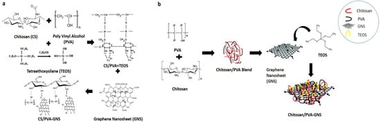 (a) Schematic illustration of the expected chemical bonding between chitosan, polyvinyl alcohol and GNS, (b) Possible scheme of interaction among CS, PVA, TEOS and GNS.