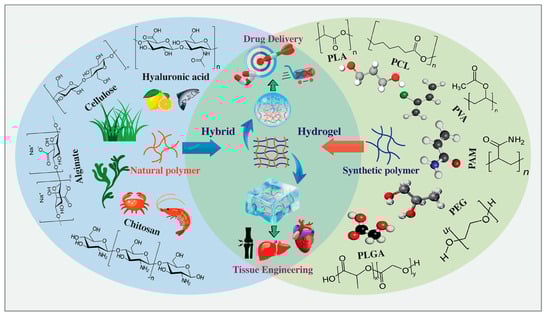 The development of hybrid hydrogels aims to address the challenges associated with the current formulations and expand their applications beyond drug delivery to tissue regeneration [2,3,6]. Hybrid hydrogels consist of diverse building blocks, such as biologically active proteins, peptides, or nano/microstructures, exhibiting distinct chemical, functional, and morphological characteristics. These elements are interconnected through physical or chemical methods. This section provides an overview of the natural and synthetic polymers commonly utilized in the fabrication of hybrid hydrogels, highlighting their characteristics and applications in biomedical research and technology.