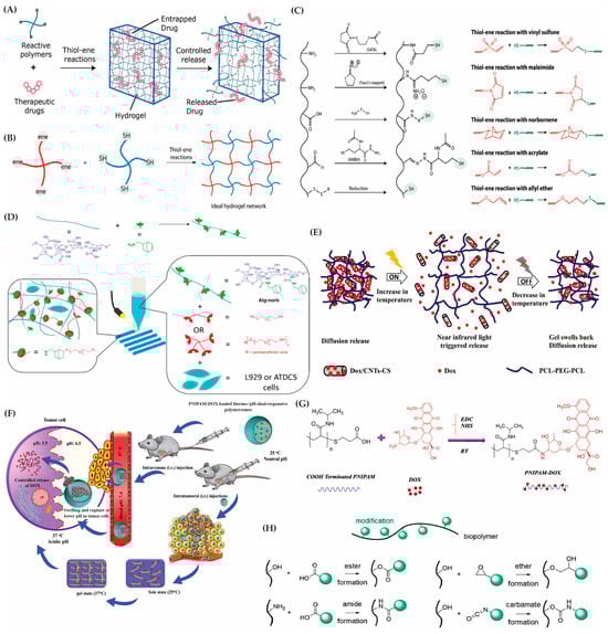 Strategies for hybrid hydrogel synthesis. (A) Hydrogel-based delivery vehicles utilize therapeutic loading and release mechanisms. (B) Thiol–ene hydrogels form through reactions between alkene and thiol groups on multifunctional macromers. (C) Thiol-functionalized macromers react with alkene-functionalized counterparts to create hydrogels for therapeutic delivery, employing various coupling strategies. Reproduced with permission from Kharkar et al. [148]. (D) Development of a photoactive alginate bioink (Alg-norb) for 3D bioprinting of hydrogels. Reproduced with permission from Ooi et al. [149]. (E) Near-infrared light-triggered drug delivery system using a thermosensitive hydrogel with chitosan carbon. Reproduced with permission from Dong et al. [150]. (F) PNIPAM-DOX-loaded polymersomes enable controlled doxorubicin release via temperature and pH responsiveness. (G) PNIPAM-DOX conjugate synthesis involves amide bond formation. Reproduced with permission from Oroojalian et al. [151]. (H) Introduction of various chemical groups for hydrogel functionalization. Reproduced with permission from Muir et al. [152].