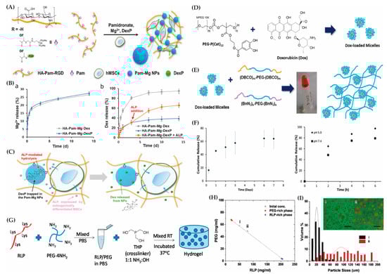 Polylactic-co-glycolic acid (PLGA), a biocompatible and biodegradable copolymer [97], has been used in the preparation of microspheres for drug delivery [98]. It efficiently controls the pH and ensures a sustained release of Mg2+ ions and oxygen [99]. The current focus is on PLGA-based thermo-sensitive hydrogels for precise drug delivery control. However, their use in tissue regeneration is limited by their mechanical weakness, often mitigated by blending with other polymers.