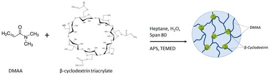 Hexane (6.8 mL) and Span 80 (0.2 mL) were added in a round-bottom glass flask and homogenized with a magnetic stirrer at room temperature. Next, given amounts of DMAA and β-CD-Ac3 (1:1; 2.5:1; and 5:1 mass ratios, respectively, of 0.06:0.06 g; 0.08573:0.03 g; 0.1:0.02 g), 0.01 g of ammonium persulfate (APS), and 25 µL of tetramethylethylenediamine (TEMED) were dissolved in 0.2 mL of water and were added to the organic medium. After blending, the reaction mixture was purged with argon for 15 min to remove the oxygen. The free radical polymerization/crosslinking reaction was carried out overnight at a constant temperature of 30 °C under continuous stirring.