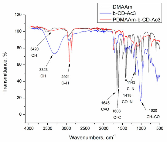 The FTIR spectrum of DMAA has characteristic peaks at 1645 cm−1 for C=O stretching, 1608 cm−1 for C=C double bonds, and 1418 cm−1 for CO–N stretching [39,40]. In the FTIR spectrum of β-CD-Ac3, the band at 3323 cm−1 is assigned to the vibration of symmetrical and asymmetrical stretching of the –OH groups, and the peak at 1020 cm−1 is associated with the vibrations of the symmetric stretching CH–CO [41]. The peaks characteristic of C=O and C=C groups (1645 and 1608 cm−1) from the acrylate units are also detected. The presence of peaks related to C–H bonds (2921 cm−1) and O–H groups (3420 cm−1) in the PDMAA:β-CD-Ac3 nanogel suggests that the polymerization of DMAA and β-CD-Ac3 was conducted successfully, and β-CD units were incorporated into the polymer network.
