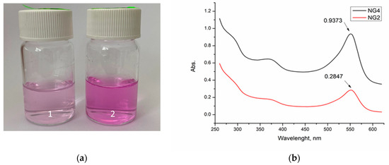 (a) Digital images of nanogels synthesized from DMAA and β-CD-Ac3 (1, NG2) and BAA (2, NG4), and (b) UV–Vis spectra of nanogels synthesized from DMAA and β-CD-Ac3 (NG2) and BAA (NG4).