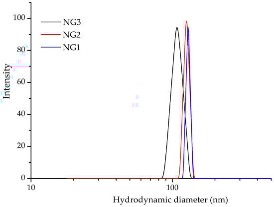 Some important physico-chemical characteristics of the nanogels were determined by using DLS and electrophoretic light scattering (ELS) analyses. Table 1 lists the hydrodynamic diameter, dispersity index, and ζ-potential of the gels as a function of their composition. The samples exhibited a monomodal particle size distribution and a relatively narrow dispersity index (Figure 4). The hydrodynamic diameter of the gels varied between 107 and 129 nm, with a tendency for slightly larger particles as the β-CD-Ac3 fraction increased. The surface charge of the nanogels was negative, which was considered advantageous for providing superior colloid stability of the systems. The negative ζ-potential values were probably due to specific interactions involving the coordination of hydroxyl anions with amino groups present on the surface of the nanogel particles. The nanogel systems remained stable upon storage at room temperature for 4 weeks and no precipitation or significant changes of Dh were observed. Therefore, we can conclude that the developed carriers are suitable for different types of drug administration.