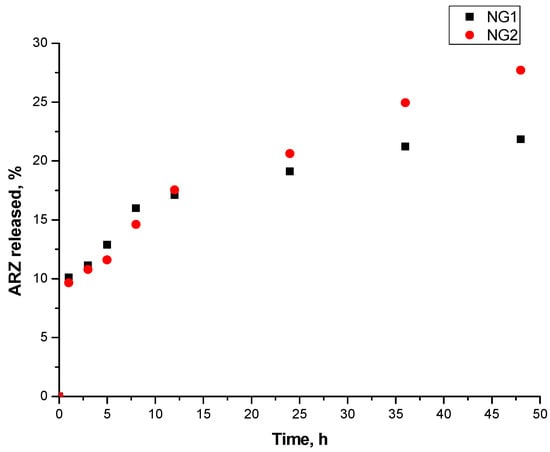The in vitro release tests (Figure 6) revealed that the release profiles have a relatively consistent rate, without significant burst effects. Thus, a sustained release pattern is evident, reaching 21.82% and 27.72% of released drug within 48 h for NG1 and NG2, respectively. These low values are most likely due to the very low solubility of ARZ, which is a weak basic drug and exhibits pH-dependent solubility [17,43]. It is most soluble at an acidic pH and has a very low solubility at a pH above six (at which the release study was conducted).