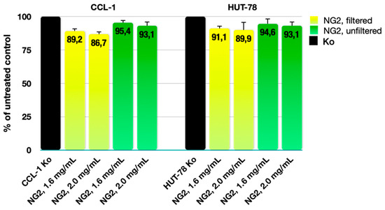 Effect of filtered and unfiltered NG2 nanogel on the cell viability in a normal murine fibroblast cell line (CCL-1) and a cutaneous T-cell lymphoma in vitro model (HUT-78) after continuous 72 h exposure to two different concentrations.