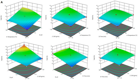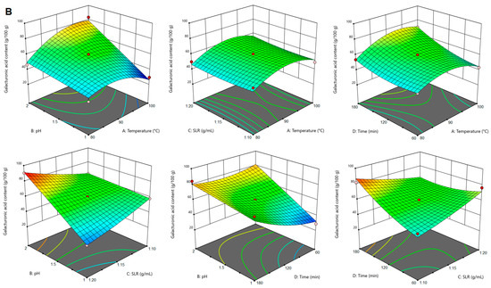 For conventional citric acid extraction of pectin from sugar beet flakes, it was observed that the yield was significantly influenced (p < 0.05) by all the extraction parameters (temperature, pH, SLR and time) and by the following interactions: temperature–pH, temperature–SLR, pH–SLR and SLR–time. As shown in the 3D graphs in Figure 1A, the increase of the extraction temperature determined a higher extraction yield. This was also observed for pectin extraction from other plant materials and was attributed to higher diffusion of solvent into the solid matrix, which increases the mass transfer of pectin into the solvent [21,22]. The same tendency was observed for SLR, while the increase of pH was not correlated with a higher extraction yield. This positive evolution of the pectin yield as determined by the decrease of the extraction solvent pH has also been reported in other studies [23,24], and was correlated with the hydrolysis of insoluble protopectin into soluble pectin. Extraction time had a positive effect on pectin yield up to approximately 120 min; however, with the increase of time beyond this point, the yield was slightly reduced. It may be in this case that during prolonged extraction the solvent causes to some extent cleavage of the glycoside and ester bonds of pectin [24].