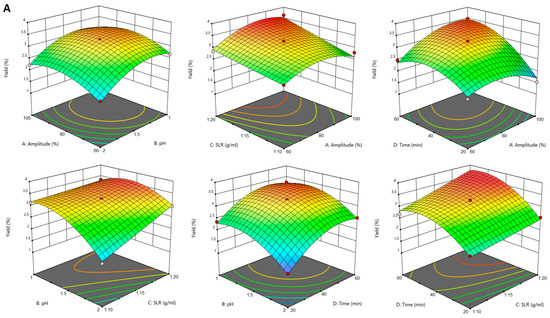 The yield of pectin extracted by PUAE was influenced significantly (p < 0.05) by all the extraction parameters (ultrasound amplitude, pH, SLR and time) and by the amplitude–SLR, amplitude–time, pH–SLR and SLR–time interactions. Figure 3A shows that pectin yield increased with the increase of ultrasound amplitude, SLR and sonication time. The positive influence of ultrasound amplitude may be attributed to the larger size of active bubbles during cavitation at higher amplitudes, which provides more energy to the reaction [28,29]. The positive effect of SLR is concurrent to that of ultrasound amplitude in the sense that a larger quantity of extraction solvent relative to plant material favours the formation of more cavitation bubbles during sonication and increases the exposure of sugar beet flakes to the extraction solvent. These findings were in line with previous reports [30]. Similar to pectin extraction from sugar beet flakes by CE and MAE, in the case of PUAE pectin yield was also higher when the extraction solution had a low pH.