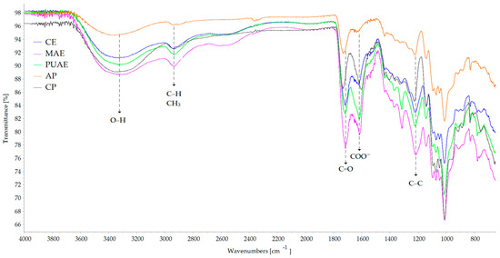 FT-IR spectroscopy was used to highlight the differences determined by the extraction method in the chemical structure of pectin. The FT-IR spectra of the pectin samples presented in Figure 4 showed that the main peaks of pectin were identified in all samples regardless of the conditions of extraction.