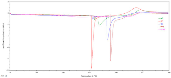 Thermal analysis by DSC of commercial pectin and the pectin samples extracted from sugar beet flakes by CE, MAE and PUAE, under optimal extraction conditions, was performed with the purpose of gathering information regarding the thermal behavior of the samples and to identify possible target applications for pectin extracted from this plant material. As the thermograms in Figure 5 show, in the region between 0 and 300 °C, pectin samples presented one or two endothermic peaks and one exothermic peak. For CE and MAE pectin samples, the first endothermic peak was observed at 156.42 °C and 160.45 °C, respectively, and the second endothermic peak was recorded at 183.97 °C and 190.08 °C, respectively. For PUAE pectin only one endothermic peak was observed, with a midpoint at 133.97 °C. The endothermic peaks were attributed to pectin melting and may be determined by conformational changes and the cleaving of chemical bonds that precede the degradation of the polysaccharide [50]. The thermal degradation of pectin was displayed on the thermograms as an exothermic peak at 255.12 °C for CE, 254.98 °C for MAE and 263.04 °C for PUAE. These values were higher than the thermal degradation reported for apple pectin [36], pectin from grapefruit peel [51] and pectin extracted from pomelo peel by pulsed ultrasound-assisted extraction [52], and confirm that pectin from sugar beet flakes can be used in applications that involve heat treatment.
