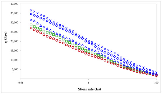 Flow curves of pectin solutions: commercial pectin AP (○) and CP (☐), and pectin extracted from sugar beet flakes by CE (Δ), MAE (◇) and PUAE (✕).