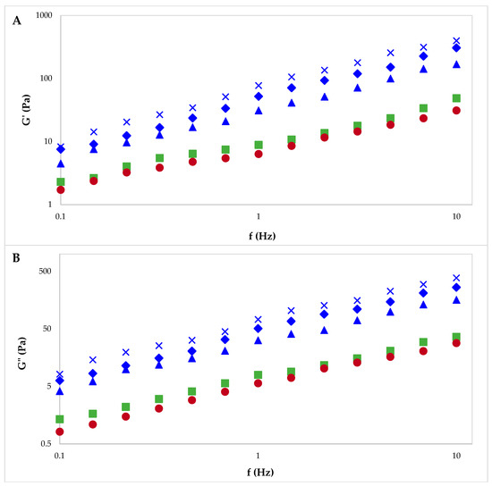 Elastic modulus (A) and loss modulus (B) for pectin solutions: commercial pectin AP (●) and CP (■), and pectin extracted from sugar beet flakes by CE (▲), MAE (◆) and PUAE (✕).