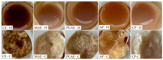 The influence of the method applied for pectin gel preparation, alongside the influence of the extraction method used to obtain pectin from sugar beet flakes, was also assessed based on the appearance of pectin hydrogels and cryogels, which was quantified through the analysis of the color parameters shown in Table 3. The hydrogels and cryogels prepared with pectin from sugar beet flakes and commercial apple and citrus pectin are shown in Figure 8. Similar to the color of pectin samples, hydrogels and cryogels obtained with commercial pectin had the highest values for lightness and were more yellow. By comparison, gels containing pectin from sugar beet flakes were darker and also characterized by more redness, and this was most notable in the case of gels made with pectin obtained using conventional extraction. Sugar beet pectin from the microwave-assisted extraction produced hydrogels and cryogels that were similar in color to gels prepared with commercial apple pectin. In terms of the differences determined by the method of gel preparation, it was observed that pectin cryogels were lighter in color and had more red and yellow hues.