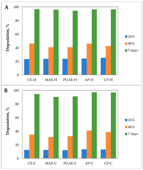 Degradation of (A) hydrogels and (B) cryogels prepared with pectin from sugar beet flakes and commercial pectin.