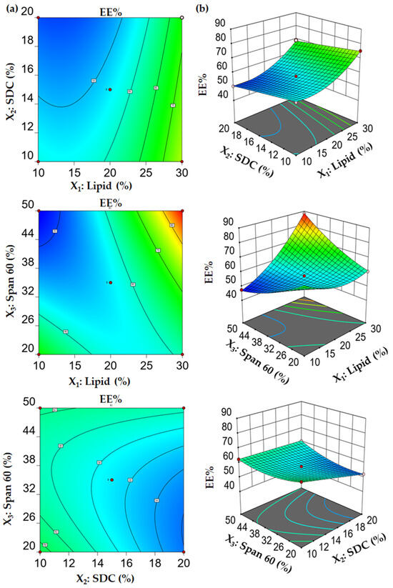 The polynomial equation (1) derived from the BBD accurately corroborated our findings, demonstrating the combined impact of lipid concentration (X1) and the opposing effects of SDC concentration (X2) and surfactant concentration (X3) on entrapment efficiency. In order to demonstrate the model’s appropriateness and statistical significance, an ANOVA analysis was conducted. The ANOVA findings, summarized in (Table S1), indicate that the model was statistically significant, with an F value of 480.16 and a p-value less than 0.0001.