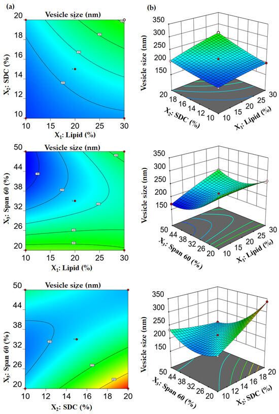 Vesicle size = 210.46 +17.89 X1 + 23.44 X2 − 28.65 X3 + 10.03 X1 X2 + 22.29 X1 X3 − 39.95 X2 X3 − 3.05 X12 + 4.17 X22 +31.86 X32