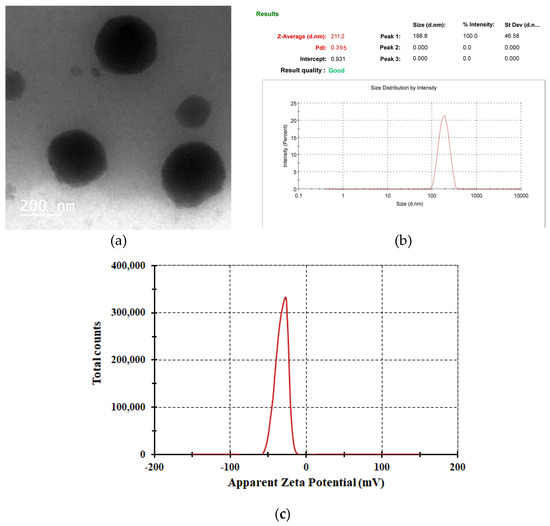 The TEM techniques were used to evaluate the morphology of the optimized Su-BL surface. The TEM examination was utilized to determine the morphology and size of the optimized Su-loaded bilosomes. The manufactured bilosomes were clearly observed as non-aggregating spheres with smooth surfaces and distinct edges, as shown in Figure 3a. The optimized Su-BLs displayed a homogenous size distribution with an average particle size of 211.26 ± 10.84 nm with a PDI value of 0.395 (Figure 3b), demonstrating a uniform size distribution. The small size of these vesicles confirms that bilosomal vesicles are effective nano-carriers for delivering Sulpiride through the skin. Zeta potential is a measurable characteristic that may be utilized for predicting the physical stability of the vesicular formulations [35]. In our study, the zeta potential of the optimized formulation (Su-BLs) was measured to be −26.9 ± 1.4 mV, as displayed in Figure 3c. The presence of a high level of negativity suggests that the produced bilosomal vesicles had a desirable level of stability. A zeta potential greater than ±30 mV indicates strong electrostatic repulsion between particles with the same charge, which prevents them from aggregating and improves their physical stability [36].