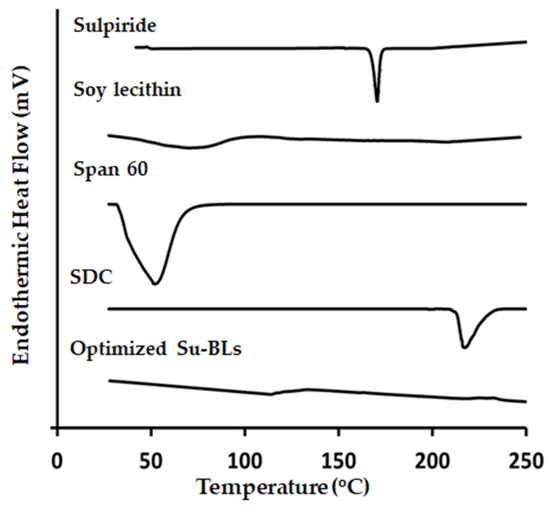 The DSC technique (DSC-60, Shimadzu, Kyoto, Japan) was utilized to analyze the thermal properties of Sulpiride, soy lecithin, Span 60, SDC, and the optimum bilosomes loaded with Su. A standard aluminum pan was used to heat 5 mg of each sample. The heating process took place within a temperature range of 10 to 300 °C, with a scanning rate of 10 °C per minute. A nitrogen purge at a flow rate of 25 mL per minute was applied during the experiment [47].