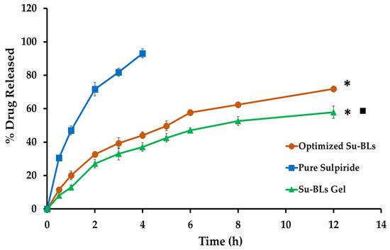 In vitro release profiles of the optimized Su-BLs, Su-BL gel, and pure Sulpiride. Results are expressed as the mean ± SD of three experiments. * p < 0.05 compared to pure Sulpiride; ■ p < 0.05 compared to Su-BL gel.