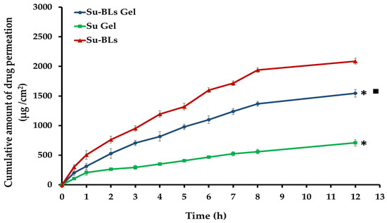Ex vivo permeation of Su-BLs, conventional Su gel and Su-BL gel. * p < 0.05 compared to Su-BLs; ■ p < 0.05 compared to Su gel.