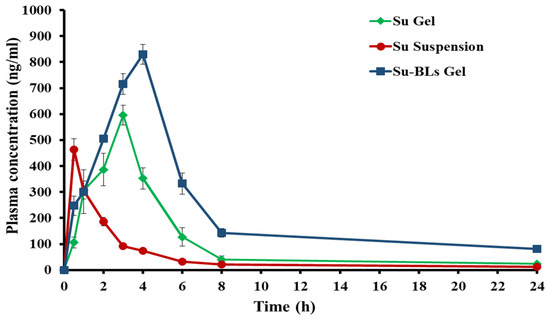 Figure 7 illustrates the pharmacokinetic characteristics of Su following the oral administration of a Su suspension (10 mg/mL) and the transdermal application of either conventional Su gel or Su-BL gel. Figure 7 demonstrates that both Su gel and Su-BL gel formulations resulted in elevated Su plasma concentrations, exceeding those achieved with oral Su suspension. The maximum plasma concentrations (Cmax) of Su after oral administration and after applying Su gel and Su-BL gel to the skin were 464.24 ± 58.45 ng/mL, 604.01 ± 54.68 ng/mL, and 829.56 ± 39.29 ng/mL, respectively. The comparatively lower maximum concentration (Cmax) of Su after being taken orally, in comparison to gel formulations, could be due to the limited solubility of Su in the aqueous medium, which would negatively affect its oral absorption. Conversely, the increased maximum plasma concentration (Cmax) of Su-BL gel, in comparison to conventional Su gel, can be attributed to the improved ability of the bilosomal formulation to penetrate the skin, resulting in the effective delivery of Su into the systemic circulation.