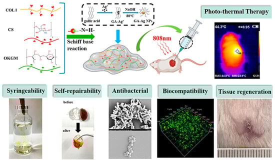 Chitosan stands out as a foundational polymer for numerous hydrogels, appreciated for its versatility in both unmodified and modified forms. Research highlights its broad utility in various fields [2,3,4,6,7,48], with chemical modifications of chitosan [1,5,8,11,14,49,50,51,52,53,54,55] focused on improving aspects like solubility, biocompatibility, and mechanical strength. Combining chitosan with other materials, such as collagen, aims to enhance its biocompatibility and applicability in tissue engineering [10,56]. Notably, the integration of self-healing collagen-based hydrogels with silver nanoparticles, as demonstrated in Figure 1, reveals their potential to provide antibacterial activity and promote tissue regeneration [56].