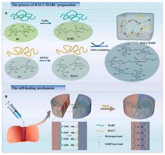 (A) The injectable self-healing hydrogel was prepared by Schiff base reaction between amine groups of hydroxypropyltrimethyl ammonium chloride chitosan (HACC) and aldehyde groups of dialdehyde modified bacterial cellulose (DABC). The prepared HACC/DABC hydrogel showed rapid self-healing and injectable properties. (B) The multifunctional properties of the hydrogel endow it with huge potential applications in wound healing [5].