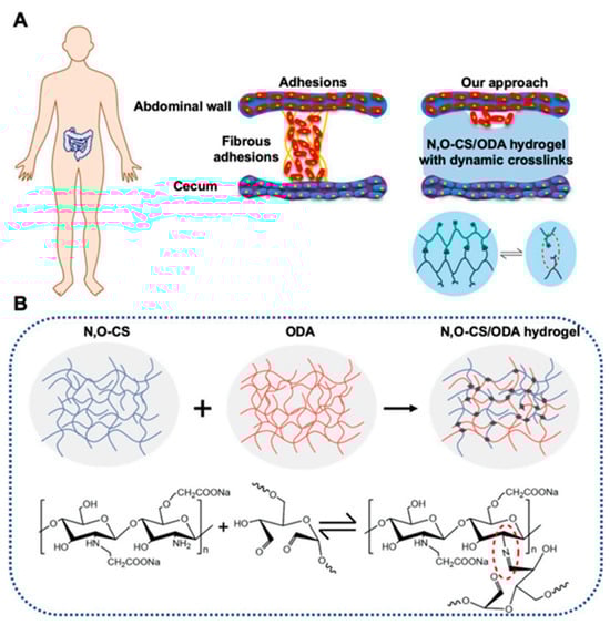 An overview of the novel self-healing, in situ injectable, biodegradable, and non-toxic hydrogels anti-adhesion barrier materials composed of N, O-carboxymethyl chitosan (N, O-CS) and oxidized dextran (ODA). (A) Diagram of adhesion formation between two tissues. (B) Schematic diagram of covalently crosslinked hydrogels formed by the in-situ polymerization of a precursor macromolecule: by using dynamic crosslinking, shear-thinning, self-healing, and viscoelastic polymer hydrogels that are placed between organs and tissues, these structures are allowed to move freely [55].