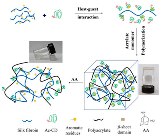 An illustration of a novel self-healing supramolecular Silk Fibroin (SF) based hydrogel with injectability was developed through a simple procedure and fabrication. The precursor of hydrogel was first formed via host–guest interaction between the acryloyl-β-cyclodextrin (Ac-CD) and SF [25].