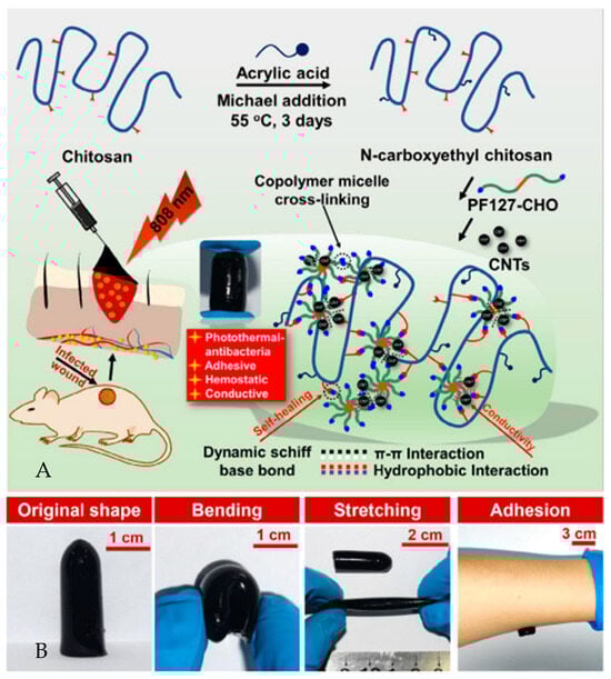 - Zhang, X.; Tan, B.; Wu, Y.; Zhang, M.; Xie, X.; Liao, J. An injectable, self-healing carboxymethylated chitosan hydrogel with mild photothermal stimulation for wound healing. Carbohydr. Polym. 2022, 293, 119722. [Google Scholar] [CrossRef]